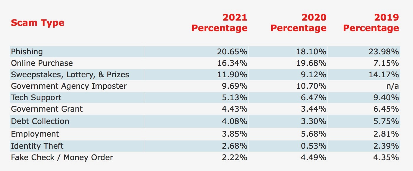 Phishing and online purchase scams took the first and second spots on BBB’s 2021 list, respectively.