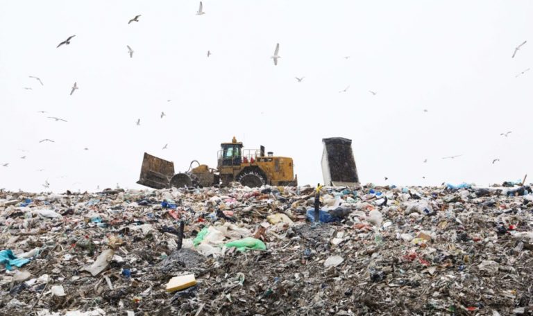 Every day, dozens of trucks loaded with waste drive through the gates of Juniper Ridge Landfill in...