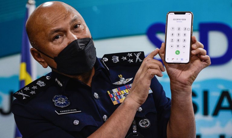 Mohd Kamarudin shows the CCID Scam Response Centre number which the public can call if they have...