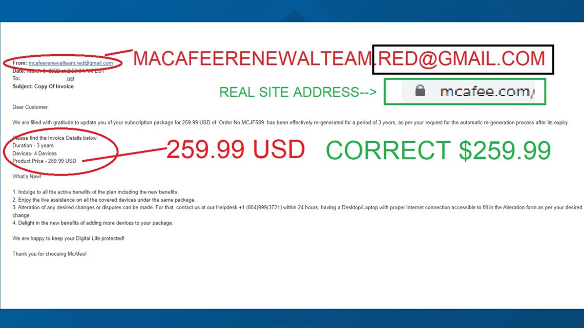 And wouldn’t you know, a few days later she got an email, it seemed to be from McAfee, the email read, ‘mcafeerenewalteam’. The email confirmed her purchase of four devices at 259.99 USD.